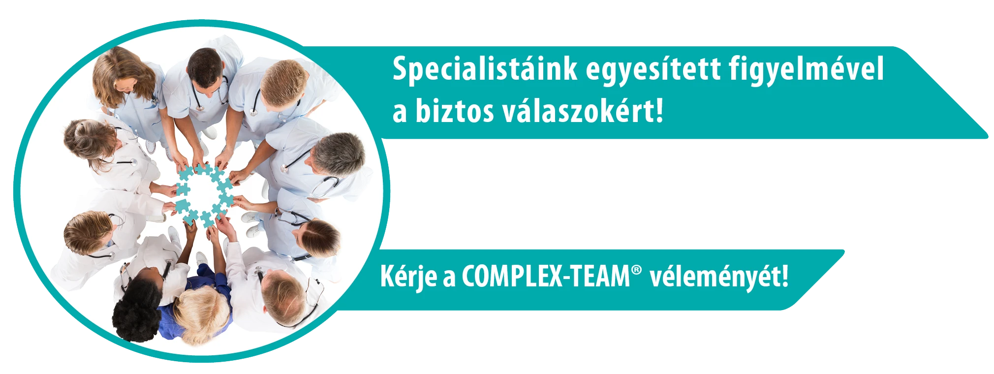 A COMPLEX-TEAM® vélemény szolgáltatásunk igénybe vételével elkerülhető, hogy Ön elvesszen a különböző szakterületek és eltérő szakmai vélemények útvesztőjében. A COMPLEX-TEAM® vélemény szolgáltatáshoz exkluzív orvosi beteg managementet is biztosítunk, amelynek keretein belül orvos kollégáink specializált informatikai rendszerünk segítségével telefonon, online vagy személyesen segítenek a további szükséges vizsgálatok, szakterületi egyeztetések előkészítésében és az ezekkel kapcsolatos tudnivalók, előkészületek pontos megértésében.